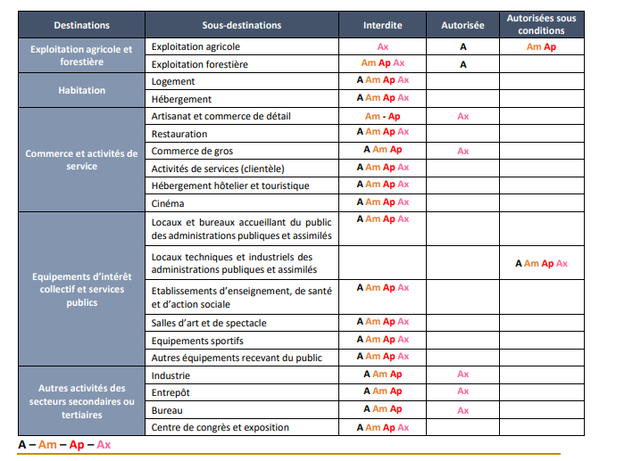 Attention ce tableau fait état des zones de bases et c’est réellement un visuel à titre indicatif. Il faut aller dans le PLU du secteur. Notamment pour identifier les Zone P (protégées) etc.. Par exemple avec des notions tel que La reconstruction sur la même emprise (sans changement de destination) des constructions